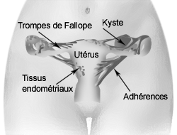Chez certaines femmes, le tissu endométrial se développe à l'extérieur de l'utérus. C'est ce qu'on appelle l'endométriose. Du tissu endométrial s'attache aux parois de l'abdomen et à d'autres organes. Ce tissu, même s'il n'est plus dans l'utérus, continue de réagir aux hormones responsables des menstruations. Normalement, la partie inutilisée de l'endomètre s'écoule par le vagin. Cependant, lorsque du tissu endométrial s'est propagé à des endroits inhabituels, l'écoulement n'est plus possible. Cela engendre de l'irritation et peut mener à la formation de kystes, d'adhérences et de tissus cicatriciels.