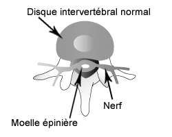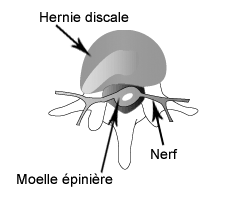 Parfois, à cause d'une pression élevée ou de mouvements répétitifs du dos, un disque intervertébral s'affaiblit. La bordure fibreuse du disque peut alors se fissurer et le centre, qui est plus mou, « déborde » de sa position normale. C'est ce qu'on appelle une hernie discale. La hernie n'entraîne pas nécessairement de conséquences. En effet, si une partie du disque sort vers l'avant (vers le ventre), il n'y a pas de symptômes et la situation se corrigera d'elle-même. Toutefois, si une partie du disque sort vers l'arrière (vers le dos), le tissu peut comprimer des nerfs et entraîner de la douleur sur tout le trajet de ces nerfs. Le plus souvent, la hernie survient dans la région lombaire, c'est-à-dire dans le bas du dos, et peut provoquer des douleurs jusque dans les jambes.